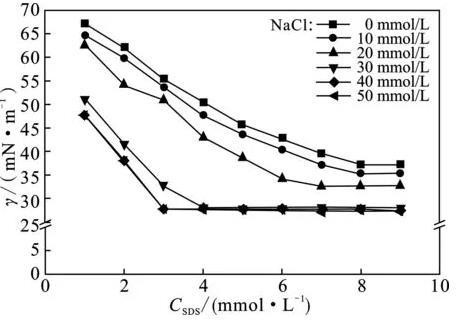 三種無機鹽的加入可以降低表面張力;當(dāng)NaCl、CuCl2,F(xiàn)e(NO3)3的濃度在40,1.25,1.25 mmol/L以下范圍內(nèi),在一定量SDS表面活性劑溶液濃度下,隨著無機鹽濃度的增加,表面張力逐漸減?。划?dāng)超過無機鹽添加濃度上限后,在一定量的SDS表面活性劑溶液濃度下,隨著無機鹽濃度的增加,表面張力將達(dá)到穩(wěn)定。同時,無機鹽濃度的增加可以降低表面張力達(dá)到最低時所對應(yīng)的SDS表面活性劑溶液濃度值(Ct),各體系下的Ct即為cmc值,當(dāng)三種無機鹽添加濃度達(dá)到上限值后,表面張力達(dá)到最小值時所對應(yīng)的SDS表面活性劑溶液濃度都是3 mmol/L,加入Fe(NO3)3、CuCl2和NaCl之后,溶液的表面張力由37.29 mN/m分別降至21.35,23.44,27.53 mN/m。