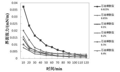 圖1不同石油磺酸鹽濃度下體系界面張力隨時間變化規律