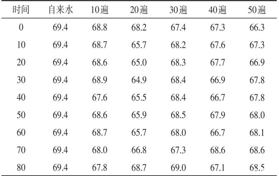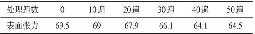 由圖表分析可知,自來(lái)水經(jīng)過(guò)不同遍數(shù)處理后,其表面張力值均有所下降。磁場(chǎng)強(qiáng)度為1.0 T時(shí),下降幅度范圍為1.0~3.0 mN·m-1。處理50遍時(shí),水的表面張力減小的幅度約為3.1,相對(duì)于自來(lái)水的表面張力減小了4.5%;當(dāng)水被處理30遍到40遍時(shí),水的表面張力的下降速率出現(xiàn)明顯減緩的趨勢(shì),水的表面張力僅僅減小了0.1 mN·m-1,相對(duì)于水被處理20遍到30遍時(shí)表面張力下降值的百分比為12.5%。