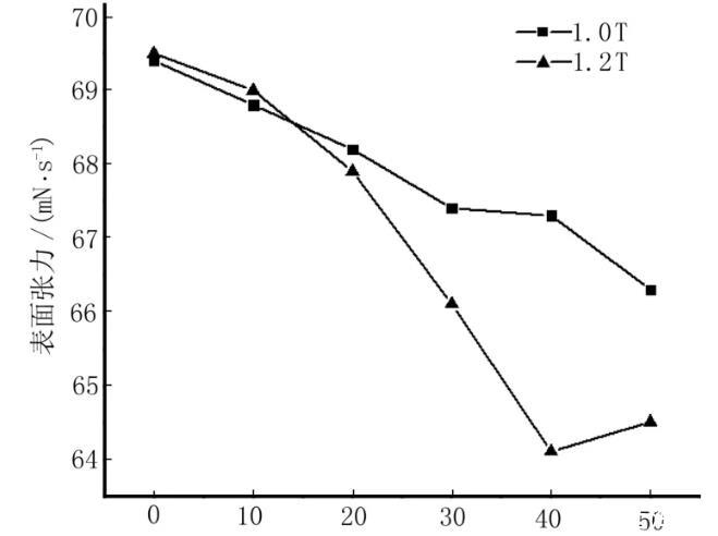 對(duì)比圖3中的2條線可知,當(dāng)磁場(chǎng)強(qiáng)度為1.2 T時(shí),磁化水表面張力的幅值下降幅度范圍為1.0~5.0 mN·m-1。由此可知,磁化水表面張力變化的幅度取決于磁場(chǎng)的強(qiáng)度。一定程度上,磁場(chǎng)強(qiáng)度越大,磁化水表面張力變化的幅值越大,并且不同的磁場(chǎng)強(qiáng)度,表面張力的變化速度有所差異。