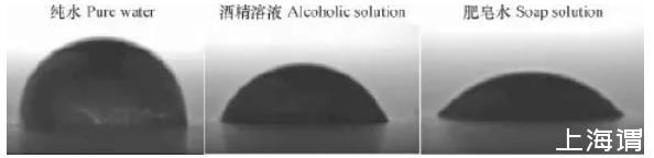 由上式可以看出,基質吸力的大小與表面張力、接觸角和曲率半徑有關。其中,基質吸力的大小與表面張力成正比,與彎液面曲率半徑成反比。因此,表面張力和曲率半徑的變化均會導致基質吸力的改變。在環境溫度為25℃時,通過JC2000型接觸角測量儀對三種試樣的孔隙液體進行接觸角測量。得到三種不同表面張力液滴的幾何形態圖如圖1所示,測量可得純水、酒精溶液和肥皂水對應的接觸角分別為85°、65°和42°,而在25℃環境下,純水、20%酒精溶液、2 g L-1肥皂水的表面張力系數分別為:7.1×10-2N m-1、4.1×10-2N m-1、2.9×10-2N m-1。表面張力是決定彎液面形狀的主要因素之一,會影響曲率半徑和接觸角的大小。很顯然,表面張力大的液體接觸角變大,曲率半徑變小。圖1中水滴表面張力大于酒精溶液,但形成的彎液面半徑卻要小于酒精溶液,同樣的,酒精溶液形成的彎液面半徑又小于肥皂水。曲率半徑越小,土體中的基質吸力越大。孔隙水表面張力會對彎液面的曲率半徑產生改變從而對基質吸力產生影響,最終影響土壤的收縮開裂。