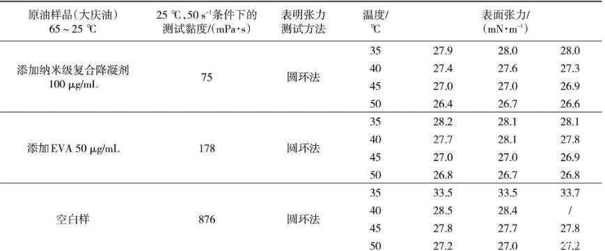 從表1可以看出,處理后添加納米級復合降凝劑100μg/mL大慶油樣、添加傳統EVA降凝劑50μg/mL大慶油樣、大慶空白油樣在25℃、50 s-1測試條件下的黏度是依次升高的,添加納米級復合降凝劑100μg/mL的大慶油樣品黏度最低,為75 mPa·s。相同的測試溫度條件下,黏度越大的油樣表面張力越大。其中,空白油表面張力最大,添加傳統EVA降凝劑的油樣次之,添加納米級復合降凝劑的油樣最小。原油油品的表面張力隨著溫度的降低而增大。