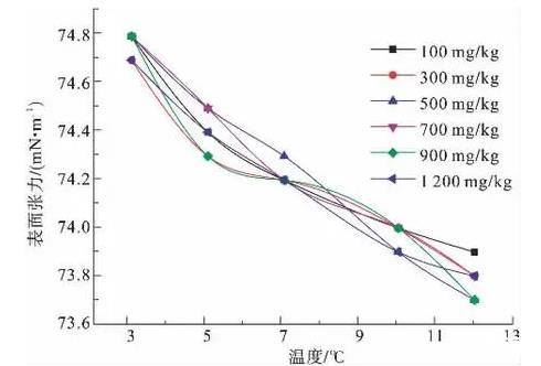 圖7為100、300、500、700、900、1 200 mg/kg濃度下,本實(shí)驗(yàn)自行合成的離子液體[HMIPS]Ss溶液的表面張力隨溫度變化示意圖。在低溫區(qū)間內(nèi)300 mg/kg溶液的表面張力曲線最低,說明該濃度的溶液表面活性最強(qiáng)。在所測(cè)溫度范圍內(nèi),整體上表面張力曲線遵循隨溫度升高而表面張力降低的一般規(guī)律,但相差不大,同一條曲線3℃和12℃表面張力值相差0.9~1.1 mN/m。