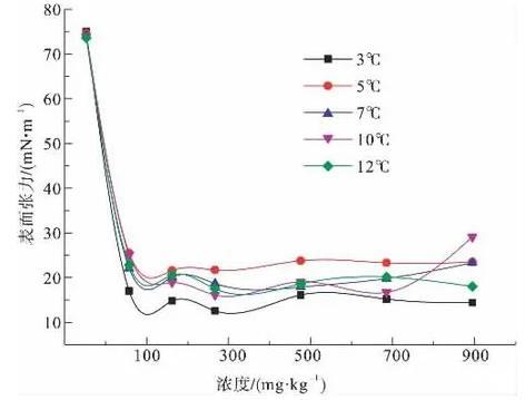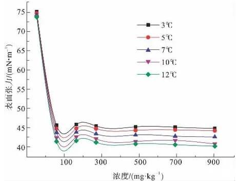 圖3為3、5、7、10、12℃下,非離子型表面活性劑P123溶液的表面張力隨濃度變化示意圖。由圖3可知,P123在低濃度下就能夠顯著降低溶液表面張力,在400 mg/kg時(shí)表面張力達(dá)到最低值,之后隨濃度增大,表面張力變化不大,因此CTAB的臨界膠束濃度CMC即在此濃度范圍附近。在所測(cè)溫度范圍內(nèi),當(dāng)P123溶液達(dá)到CMC以后,表面張力值在40.5~45.5 mN/m之間。隨溫度變化,表面張力值相差較大。