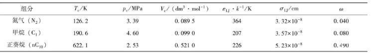 Zhang等[11]設(shè)計(jì)出納米實(shí)驗(yàn)裝置,并測量甲烷-正葵烷(C1-nC10)和氮?dú)?正葵烷(N2-nC10)混合物在納米孔(rp=50 nm)中的界面張力,其具體測量值見表1。對比實(shí)驗(yàn)測量的界面張力與模型預(yù)測值,是檢驗(yàn)建模正確性的重要方法之一。因此,筆者對不同溫度下的C1-nC10和N2-nC10混合物的界面張力進(jìn)行預(yù)測,其使用到的純組分狀態(tài)方程參數(shù)列于表2。