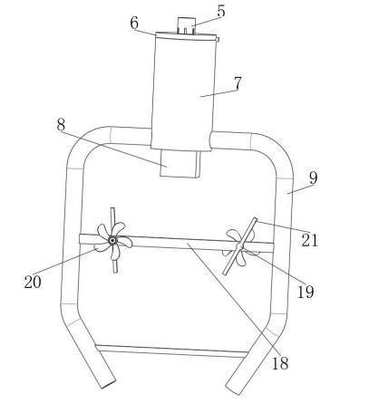 步驟三:在兩根出液管帶動加強桿轉(zhuǎn)動的同時將帶動渦輪葉片轉(zhuǎn)動,使轉(zhuǎn)動的渦輪葉片能夠通過轉(zhuǎn)軸帶動攪拌桿轉(zhuǎn)動,使攪拌桿對混料桶內(nèi)的試劑溶液進行橫向攪拌混合,提高混合效果。