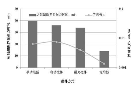 mN/m;手動混搖的方式達到超低界面張力的時間最長,為40分鐘,電動攪拌和磁力攪拌差別不大。混勻器攪拌方式使溶液能在短時間內達到均相且均相程度高,均相程度越高,達到超低界面張力的時間越短。